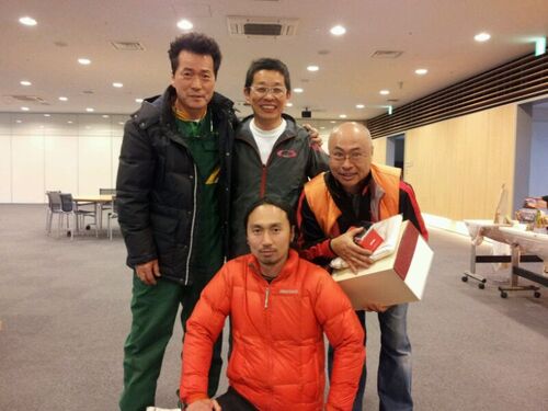 表彰式で、山本のおやじさん、僕、丹生さん そして、前が健ちゃん の常連関西ヒストリックレースの先輩の方々です。 布浦ちゃん、僕、こうちゃんの弟、前のお子さんは主催者岡さんのお子様、そして、こうちゃん 残念! 山本自動車さんの コルティナ が居ない…